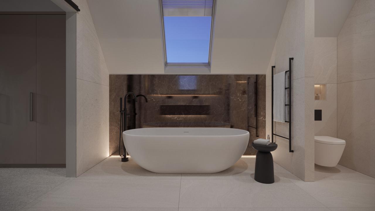Designed by Arno bathrooms, and with Italian tiling by Pietracasa, this bathroom is nothing short of luxury. As you walk in, you are met with a matt white stone freestanding bath to one side which sits in front of a bronze marbled glass wall which is lit up with lighting set into the floor behind the bath. The other side will feature the his & hers vanity area with a bespoke wall-to-wall mirror surrounded with LED lighting. Behind two walls sits the WC and to the other side, a walk-in shower with soft lighting to gently illuminate the shower. The secondary lighting strips around the room come on via PIR as you walk through the door with additional lighting turned on by switches. Neutral large format tiles finish the room with matt white and brushed black sanitaryware.