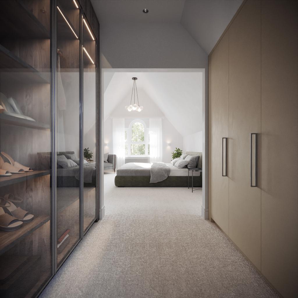 The main bedroom is a real feature of this house, with high ceilings and an arched window overlooking the garden. Lighting has been carefully considered with wall lights either side of the window and a drop down pendant illuminating the vaulted ceiling. Off the bedroom is a walk-through dressing area with built-in Italian wardrobes on both sides which have been thoughtfully designed and installed by Hub Interiors. Walnut wardrobe carcasses are complemented by a bronze glass door with hidden LED strip lighting to give the wardrobes a luxurious finish. The additional set of wardrobes opposite has a solid door finished in a cashmere colour. A frosted sliding glass door from the dressing area leads directly into the main en-suite.